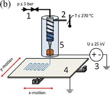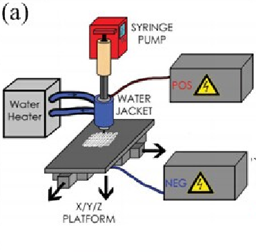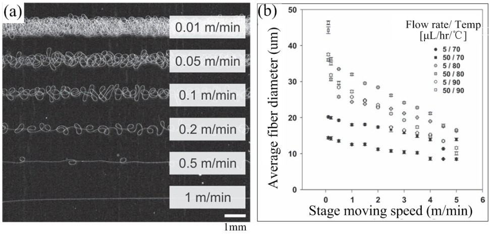 另外聚合材料的熔化温度对于熔体法EHDP 3D喷印影响很大。Brown等人发现当熔体的温度从70度升高到到90度时,丝径也会相应的从10um升高到30um,这是因为聚合材料粘度的下降导致材料在收集板上的不充分凝固。熔体法EHDP 3D喷印所选用的工作台移动速度相对溶液法较低,以便配合较低的喷液速度。以Wei等人的实验为例,他们采用的是0.8mm/s的移动速度,除此之外,还将针头的直径缩小为100um,从而喷印出次微米级的3D支架。