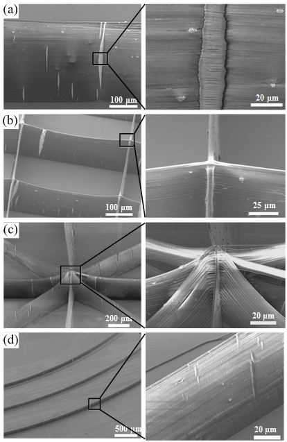 Lee等人实验发现PCL浓度在70%(w/v)丝径能达到最小,大约20um。同时也纺出更多3D微型结构,如单壁层、交错壁、晶格与同心圆晶格,如下图12所示。单壁层最小宽度能达到10um,高深宽比能达到60。