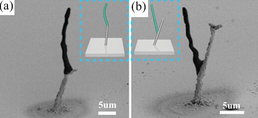 除此之外文中还引用了Huang等人一组实验,他们通过逐步增加工作台的移动速度(0.01 m/min至1 m/min),观察到纤维丝从弯曲到竖直的状态,如图2所示,