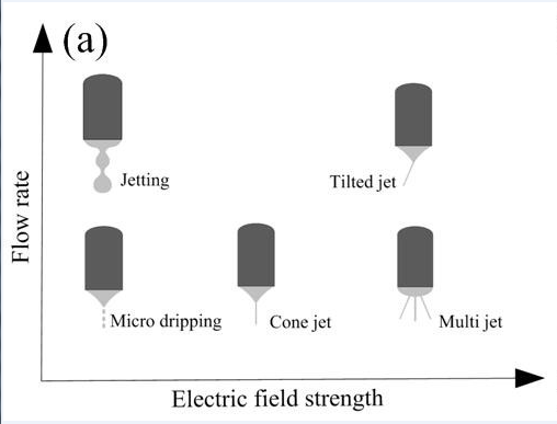 EHDP喷印技术为何能受到了业界的广泛关注呢?那是因为它采用低能耗、高效率电流体动力诱导自喷法来构造客制化的微米级/纳米级结构。总体上EHDP的技术原理与传统的静电纺丝技术原理相类似。文章首先论述了电场强度与工作台移动速度对于EHDP喷印的影响,电场强度与流速对于喷嘴喷射模式的影响如下图1。