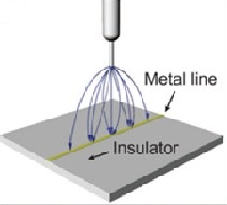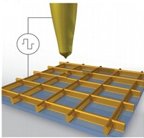 因为上述的残留电势累积问题很大程度影响到了沉积工艺的精准性,微滴模式日渐受到关注。它是以喷墨技术转辙指令控制不连续、周期性喷射进行喷印,基于这种点状可控性工艺,喷印出微米级/纳米级的3D结构。Schneider教授等人提出电流体动力纳米滴喷印的方法制造高深宽比的金属电极,如图13。