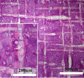 由于熔体法喷印的结构尺寸通常在800nm至40um,十分接近于生物细胞结构与胞外微环境,因而熔体法3D EHDP也可广泛应用于组织工程学和再生医学。在PCL喷印支架上实现了人体软骨细胞与水凝胶的合成,经过7天的培养人体软骨细胞还能够维持其球体形态,如图6。