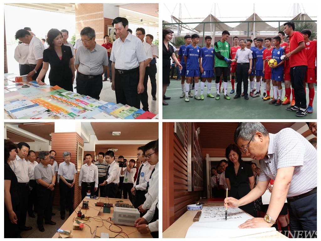 为充分了解西安交大的综合教育改革工作,陈宝生部长一行走进西安交大附属中学,调研基础教育领域的综合改革工作情况。附中校长王佩东向陈宝生部长一行详细介绍了交大附中的办学理念、品格培养、科技创新、素质教育、教学改革等工作情况。陈宝生部长观看了附中学生精彩纷呈的大课间体育活动,他走进学生们中间,关心他们的体育爱好培养和体育社团建设情况,勉励学生们继续将体育锻炼和学习生活紧密结合,锤炼健康的体魄和坚强的品质。在学生科技创新作品展示区,陈宝生部长和学生们频频互动,亲身体验学生自主研发的猜拳机器人等创新作品,他高度赞许学生们的创新意识和动手能力。在观看完学生自编自演的精彩歌舞之后,陈宝生部长挥毫为学生们题写寄语:“男生要有绅士风度,女生要有淑女气质。绅士风度、淑女气质,源于喜怒哀乐未发之际,成于喜怒哀乐已发之时。”以饱含哲思的论述,寄语交大附中持续推进思政育人、注重人格养成。