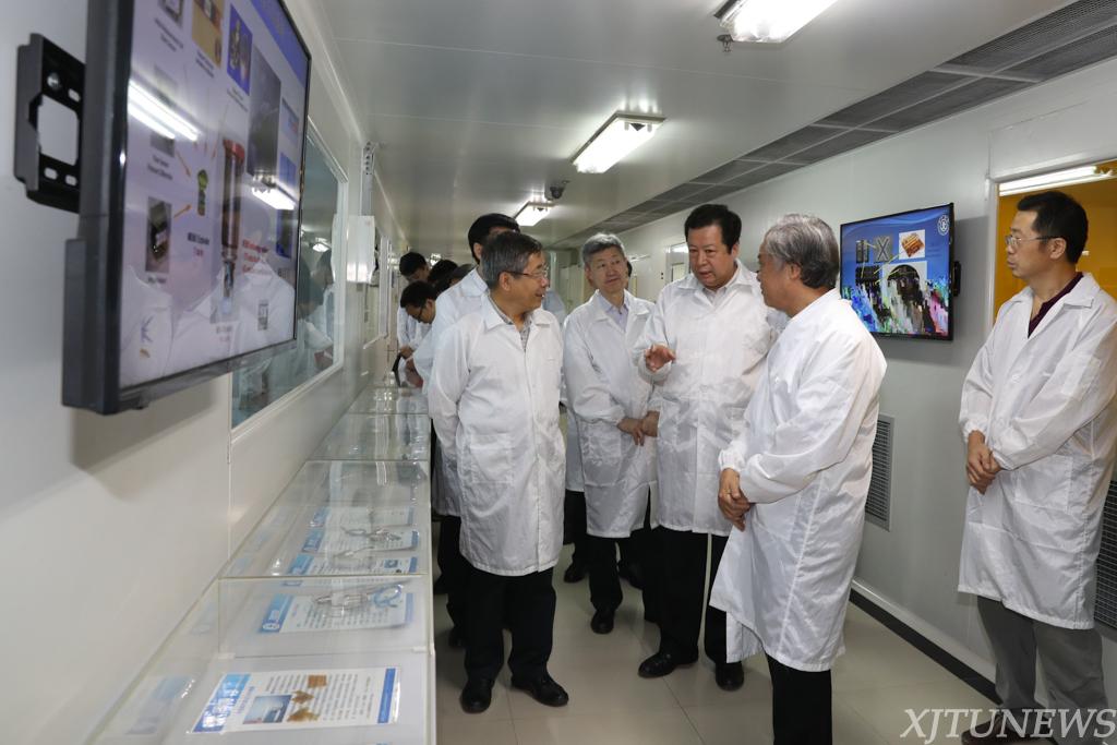 在超精密制造工程实验室,蒋庄德院士向陈宝生部长介绍了西安交大在高精密测量和高精密制造方面的创新探索及学术传承,陈宝生部长充分肯定了实验室在学术精神培育传承方面的创新举措。在生物制造实验室,实验室主任李涤尘教授向陈宝生部长一行介绍了生物3D打印技术的应用和发展,陈宝生部长和科研人员不时交流、详细了解细胞打印技术的临床应用情况,并对西安交大推进医工结合、服务社会发展的科技创新成果表示肯定。