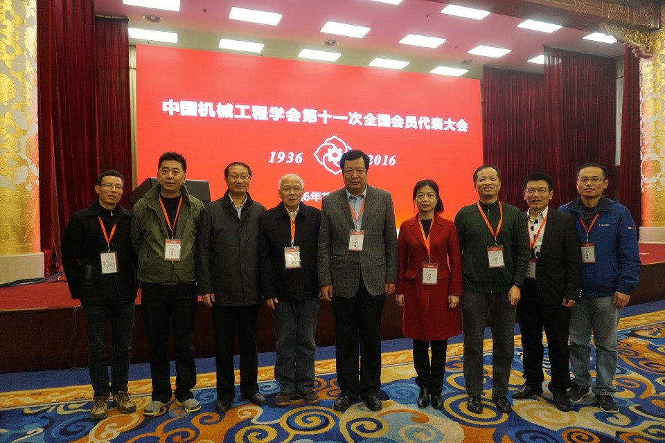 我校参会代表丁建军(左一)、洪军(左二)、蒋庄德(左五)、苏秦(左六)、李涤尘(左七)、田小永(左八)、赵立波(左九)、陕西省机械工程学会副理事长兼秘书长王润孝(左三)、陕西省机械工程学会常务副理事长任国梁(左四)等在大会会场