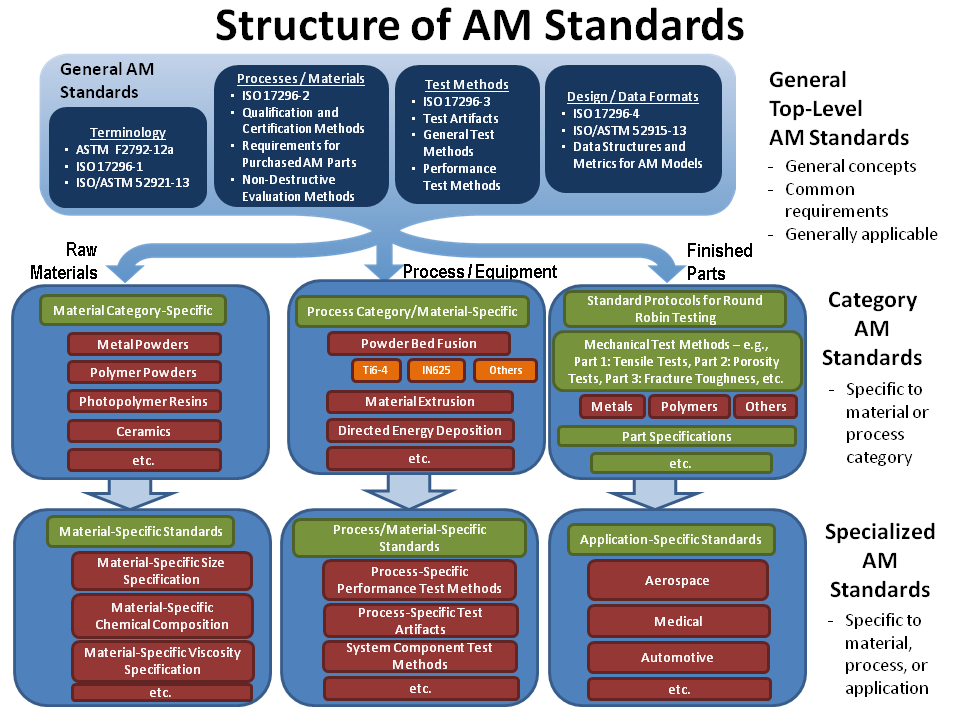 The following structure for AM standards has been agreed by ISO and ASTM in July 2013 (Diagram courtesy of UNM Bureau de Normalisation par délégation d'AFNOR):