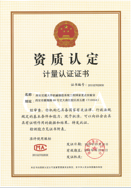 经过一年多的认真准备,西安交通大学机械制造系统工程国家重点实验室于2015年03月12日至14日通过了陕西省质量技术监督局直属资质评定评审组对实验室的资质认定(计量认证首次评审)的现场评审,并于近日获得陕西省质量技术监督局颁发的实验室资质认定计量认证(CMA)证书,可向社会提供检测服务,具有法律效力。