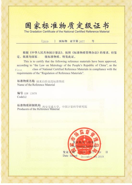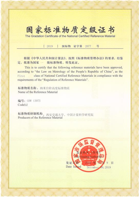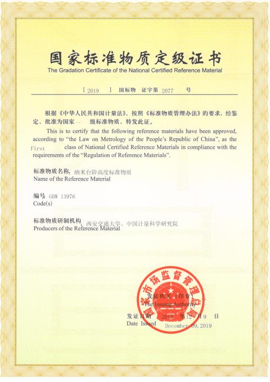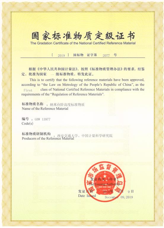 12月9日,国家市场监督管理总局批准了西安交通大学主导研制的四种规格纳米台阶高度标准物质为一级标准物质(编号:GBW13975、GBW13976、GBW13977、GBW13978)。这是目前国内尺度最小的纳米台阶标准物质样,填补了国内亚50nm台阶高度标准物质的空白,实现了替代进口,提高了我国在纳米几何量计量领域的核心竞争力和整体技术水平。