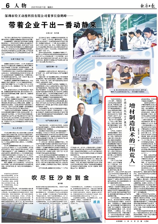 随后,由他主持完成的“快速成型制造的若干关键技术及其设备”,获2000年国家科技进步二等奖,这一技术应用在家电、汽车等产品开发中,使产品开发周期与费用降低为原来的30%以下,光固化3D打印技术基本实现完全国产化。随着元器件的持续国产化,设备价格和使用成本也降到进口技术的10%以下。