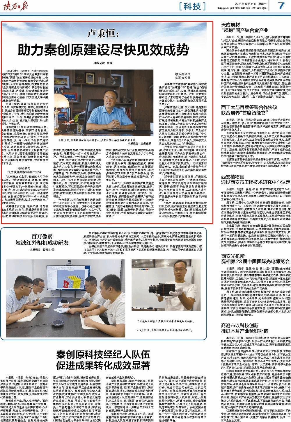 聚焦建设立体联动“孵化器”、科技成果产业化“加速器”和“两链”融合“促进器”三大目标,3月30日,陕西正式启动秦创原创新驱动平台建设。对此,卢秉恒兴奋不已:“秦创原对于全省加快突破产业关键核心技术,实现创新驱动发展具有重要意义。”