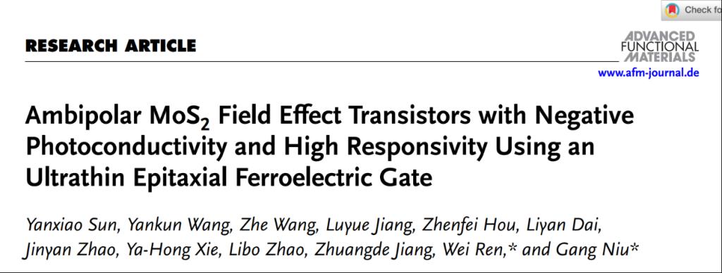 该成果以“基于外延铁电栅的具有负光电导和高响应度的双极性MoS2场效应晶体管”(Ambipolar MoS2Field Effect Transistors with Negative Photoconductivity and High Responsivity Using an Ultrathin Epitaxial Ferroelectric Gate)为题发表在Advanced Functional Materials上。西安交通大学牛刚教授和任巍教授为该论文的通讯作者,西安交通大学蒋庄德院士、赵立波教授为论文共同作者。论文的合作单位还包括美国加州大学洛杉矶分校。