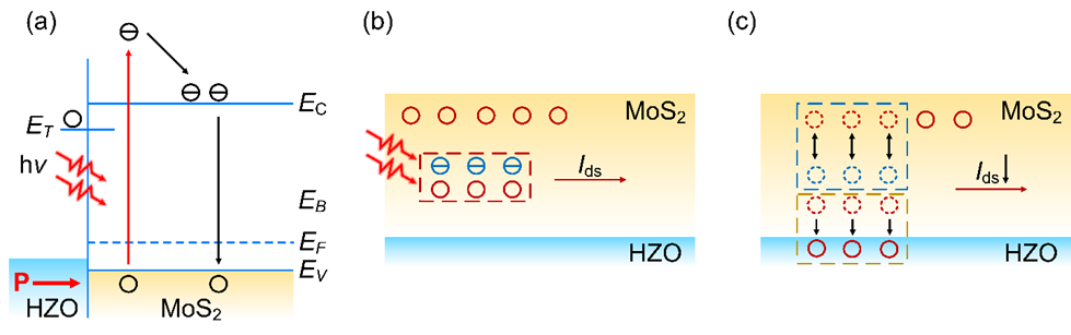 图6.二硫化钼场效应晶体管负光电导效应原理示意图。图片来源:Advanced Functional Materials