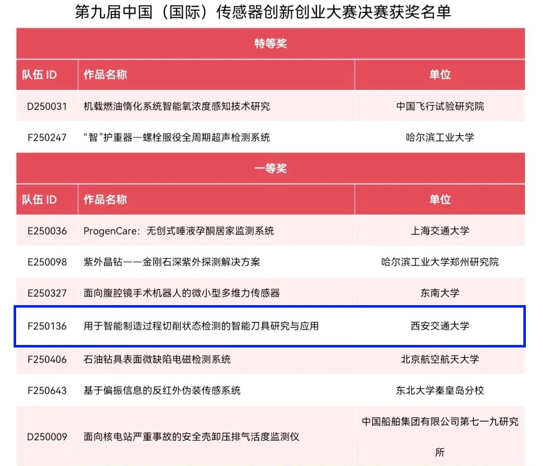在11月29日举行的第九届中国(国际)传感器创新创业大赛全国总决赛中,我校机械工程学院精密工程研究所硕士研究生张烁、李尧(指导教师赵友、赵玉龙)的参赛作品《用于智能制造过程切削状态检测的智能刀具研究与应用》斩获全国一等奖。