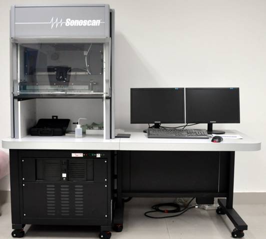 超声探头频率5MHz~230MHz,X、Y扫描极限分辨率为±9μm(频率为230MHz),2个独立通道,增益最大95dB,具有实时扫描、反射扫描、透射扫描等功能。X、Y工作范围为300mm*300mm,Z轴方向空间为300mm。反射法与透射法结合的水浸聚焦,扫描速度最大600mm/s,样品最大厚度为10mm.
